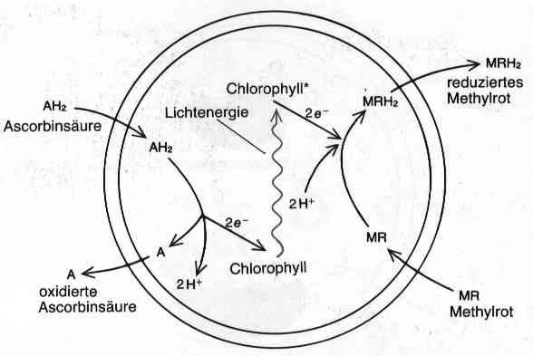 Ähnliche Anordnungen (Abb. 1.2) zeigten, dass auch Koazervate mit mehrstufigem Stoffwechsel wachsen und sich vermehren konnten. Doch Oparin ging noch weiter und versuchte, heute elementare Stoffwechselprozesse darzustellen. Als Beispiel möchte ich hier eine Elektronentransportkette, wie sie heute bei der Photosynthese und ihrer Gegenreaktion, der Atmungskette vorkommt (Abb. 1.3): Oparin ersann ein Tröpfchen, in das er Chlorophyll gab, und dem er Ascorbinsäure (Vitamin C) und oxidiertes Methylrot als Substrate anbot. Die Ascorbinsäure kann das Methylrot allein nicht reduzieren, doch wenn man das Tröpfchen mit Licht bestrahlt, gibt das Chlorophyll zwei durch Licht aktivierte Elektronen an das Methylrot ab, die Protonen folgen, und die beiden Elektronen werden der Ascorbinsäure abgezogen. So ist es am Ende doch die Ascorbinsäure, die das Methylrot reduziert. Bei der Photosynthese wird auf diese Weise NADP+ zu NADPH+H+ durch Wasser (H20) reduziert. Sidney W. Fox: Mikrosphären